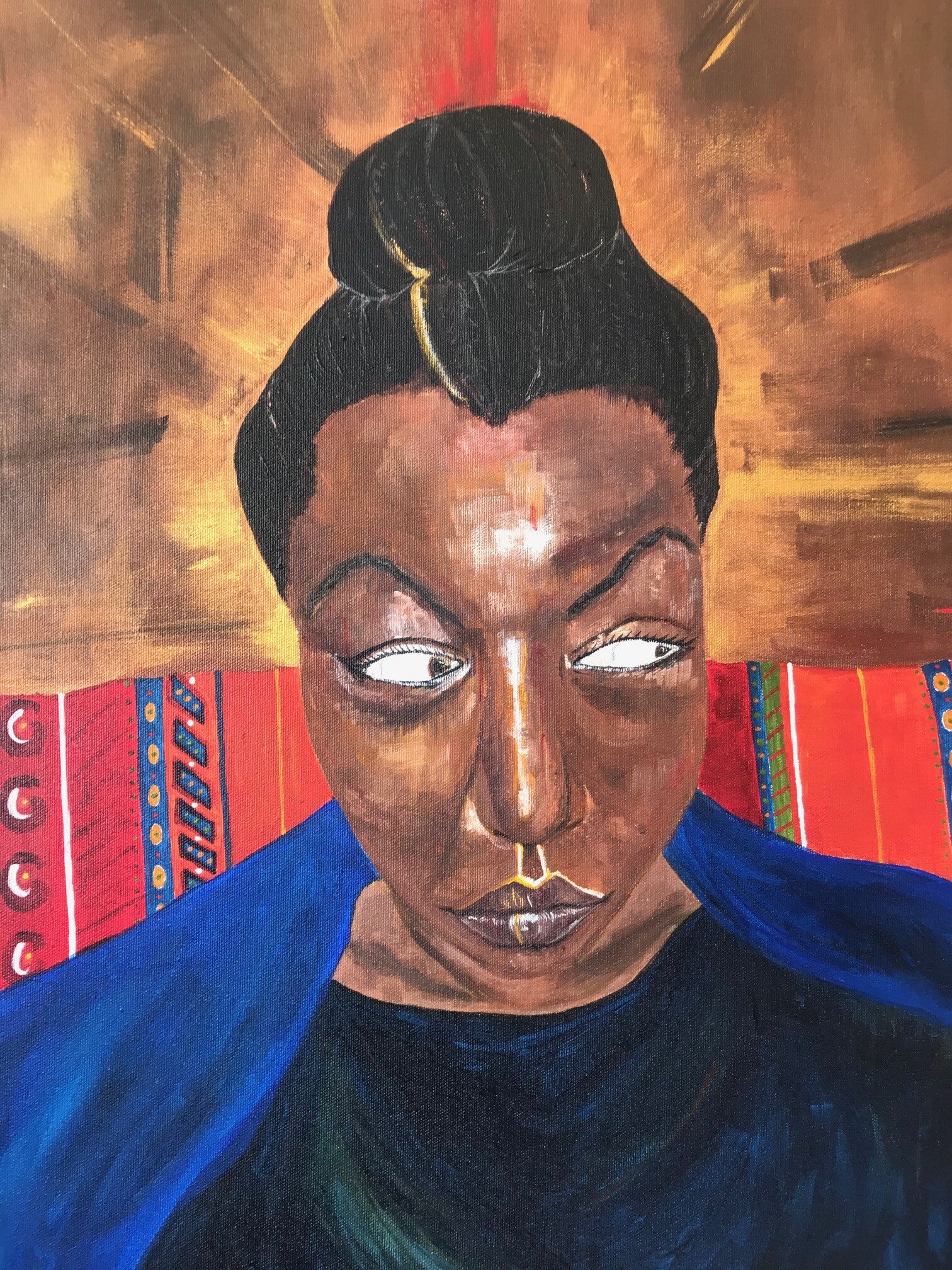 This self-portrait feels candid. We want to know about her, what she is thinking. Fiona is drawn to create self-portraiture paintings because when we look in the mirror, we do not only see our face and physical features but that of our parents and siblings, history and our ancestry.